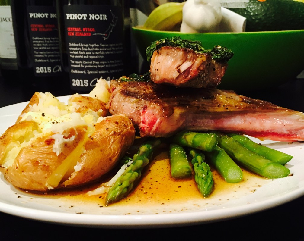 Place your asparagus on the plate with your lamb chops on top and pour the apple and mint sauce over the lamb.