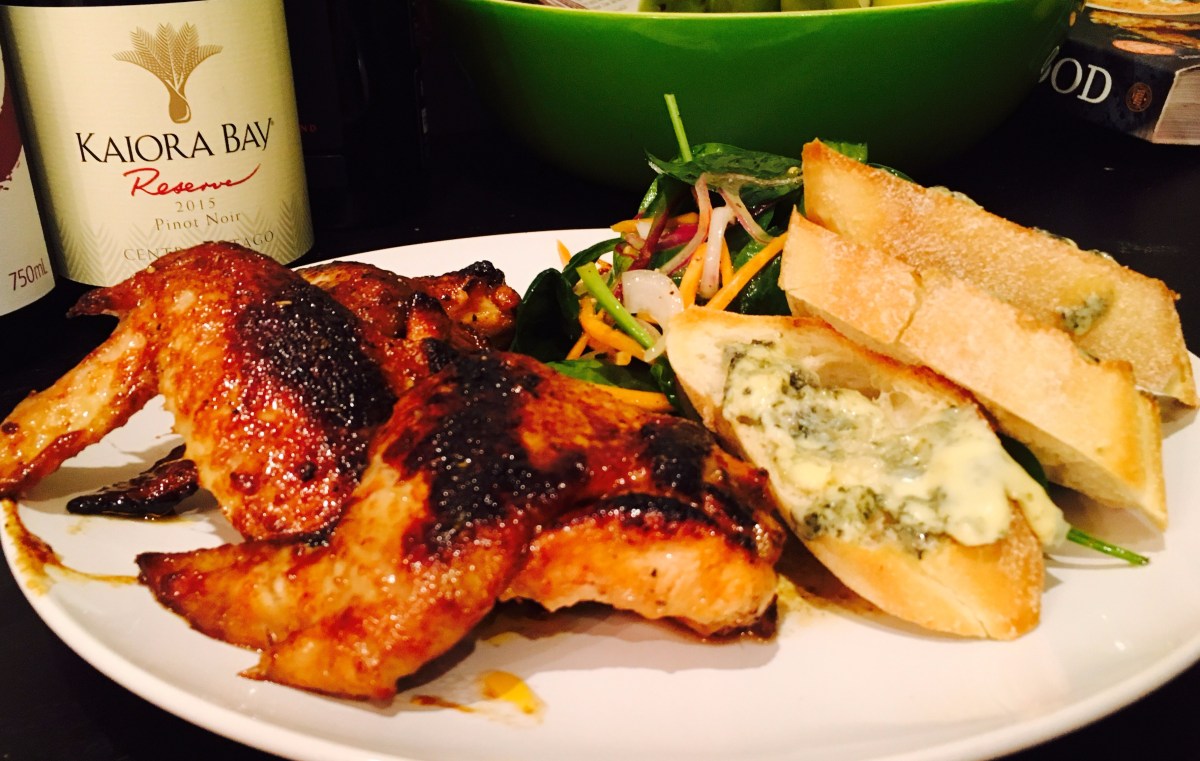First you need to marinate the chicken in soy, honey, powdered or chopped chili, BBQ sauce, olive oil and pepper. Then whip up your salad with a bit of olive oil, lemon, dash of balsamic, salt and pepper. You can BBQ the chicken or if the weather isn’t great, sear the chicken for about 3 minutes each side and until golden and pop in the oven for another 6-8 min depending on the size of the wings. Next, grill the bread until golden brown, remove from oven and add blue cheese. Place the blue cheese bread under the grill for another minute.