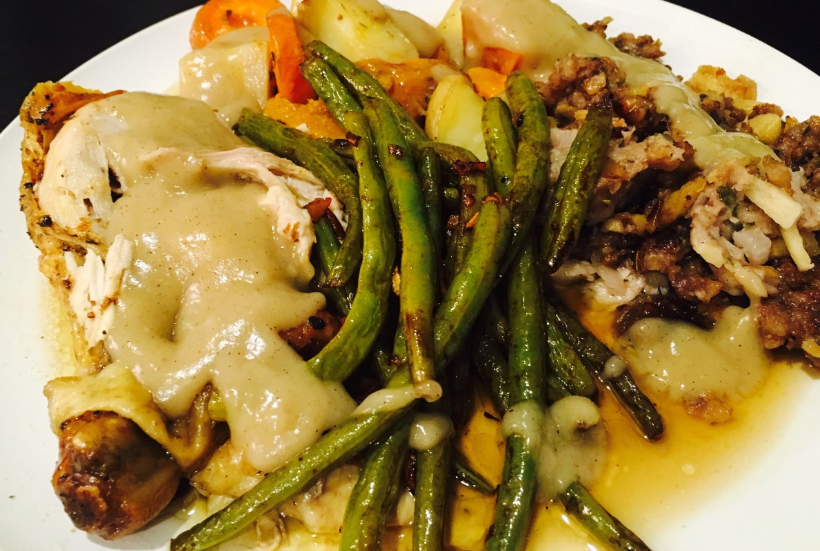 This past Easter I decided to go traditional! It’s not every day I go back to my roots but there’s something about the holiday’s that make you miss home. And nothing brings you back to your childhood like a stuffed bird, roasted vegetables, greens and gravy! Since it was only the 3 of us over Easter I decided a whole chicken would be more than enough.